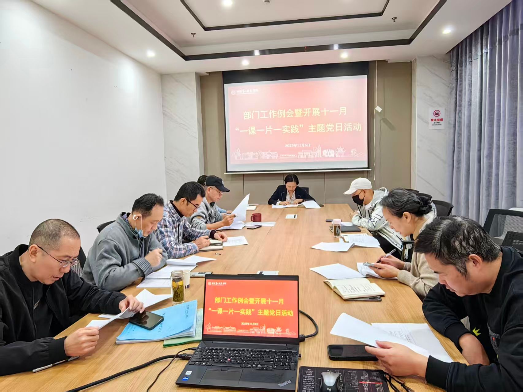 11月6日,保卫部在百熙楼104室召开部门工作例会暨开展十一月“一课一片一实践”主题党日活动。活动由党支部书记成海英主持,部门全体同志参加。